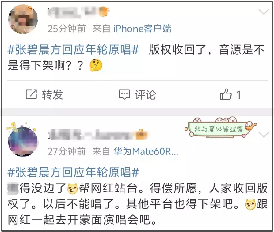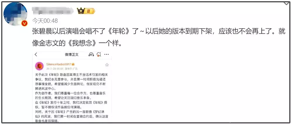 这就意味着,只要张碧晨方没有彻底购买原创歌曲版权,人家词曲创作者等到版权到期,说不让张碧晨唱就能不让张碧晨唱,甚至可以随时下架张碧晨演唱版本。