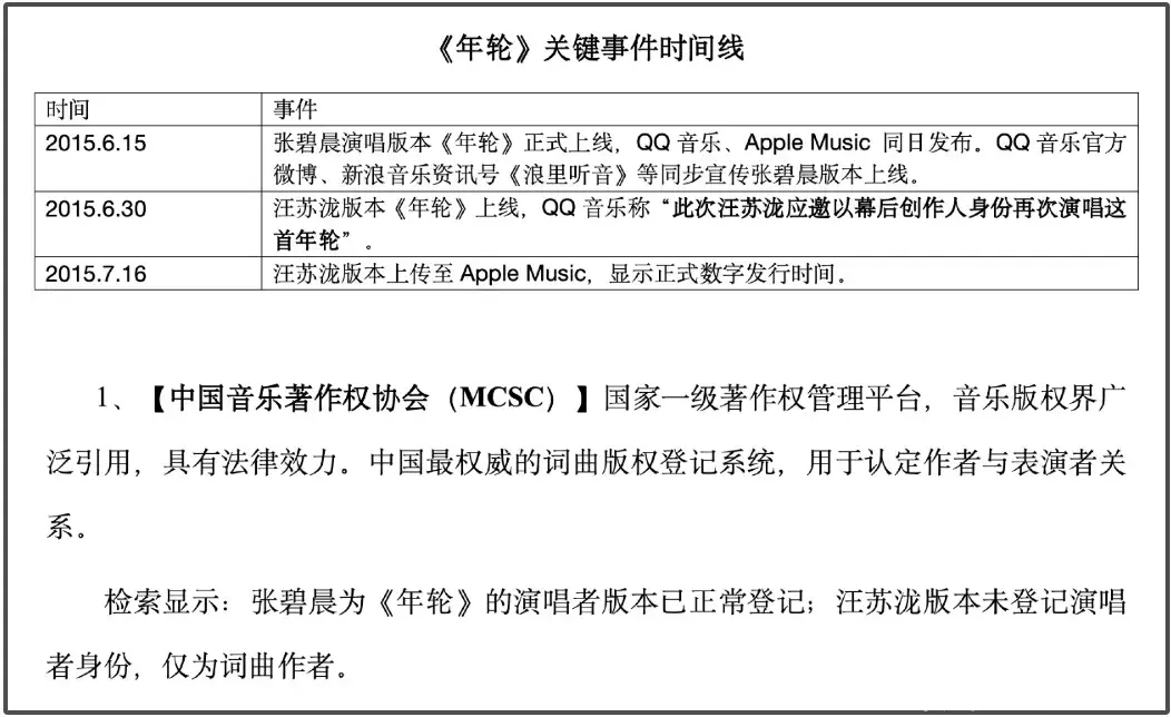 张碧晨方整理了《年轮》发表时间线,认为张碧晨版本比汪苏泷版本更早发布,张碧晨就是唯一原唱,同时拿出了中国音乐著作权协会认证,表示张碧晨版本经过正常登记,显示为演唱者,汪苏泷版本则没有登记,仅为词曲作者。