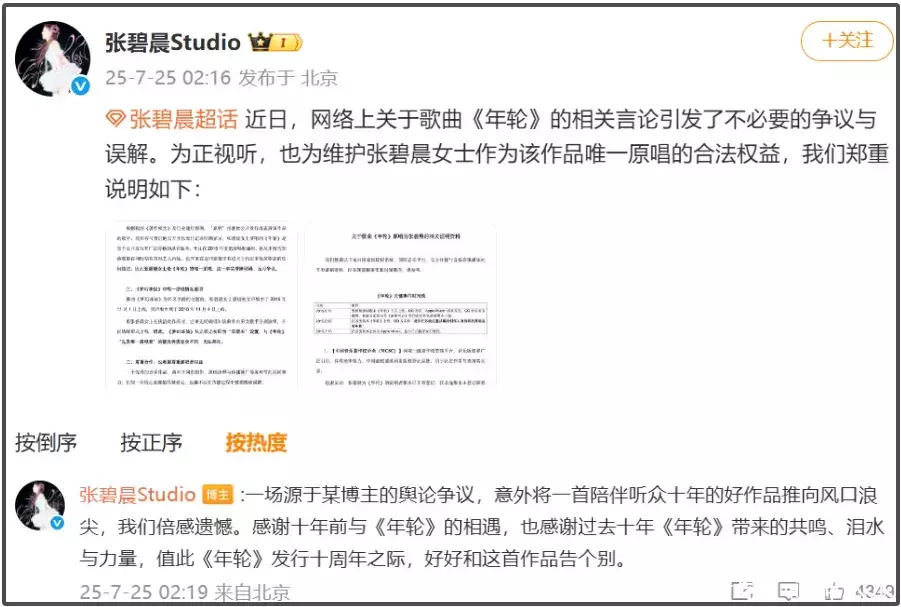 只不过可能有人没有注意到,张碧晨工作室发布“唯一原唱”声明之后,默默在评论区回复了一段:“一场源于某博主的舆论争议,意外将一首陪伴听众十年的好作品推向风口浪尖……值此《年轮》发行十周年之际,好好和这首作品告个别。”