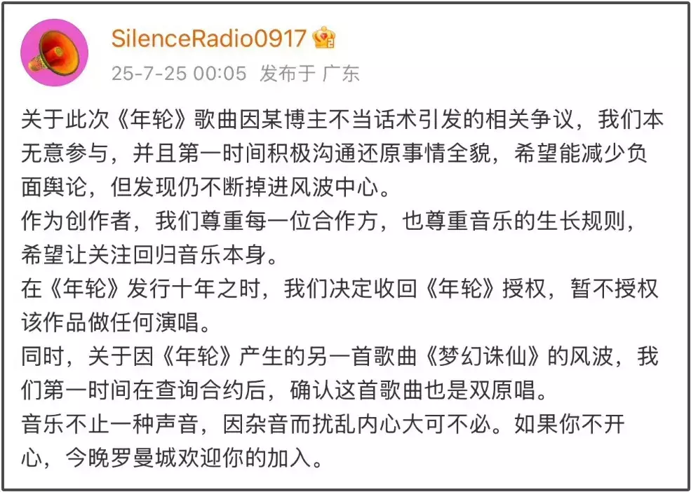 不过换个角度想,《年轮》原唱争议,某种程度上,可以推动华语乐坛版权规范化,各位词曲创作者是时候检查一下自家版权了,如果到期了对方还想唱,不收回的话,就可以收钱了。