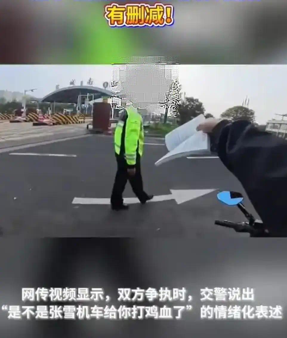 该交警的完整描述是:“是不是张雪机车给你打鸡血了,中国摩托车又行了?张雪是不是你们的模范和榜样,但人家是合理、合规、合法的。”